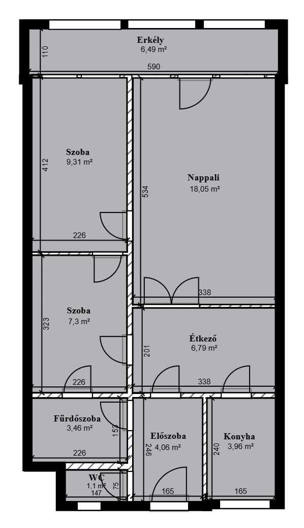 - 73,5 négyzetméteres lakás (konyha + étkező, 3 hálószoba, fürdőszoba, WC)
