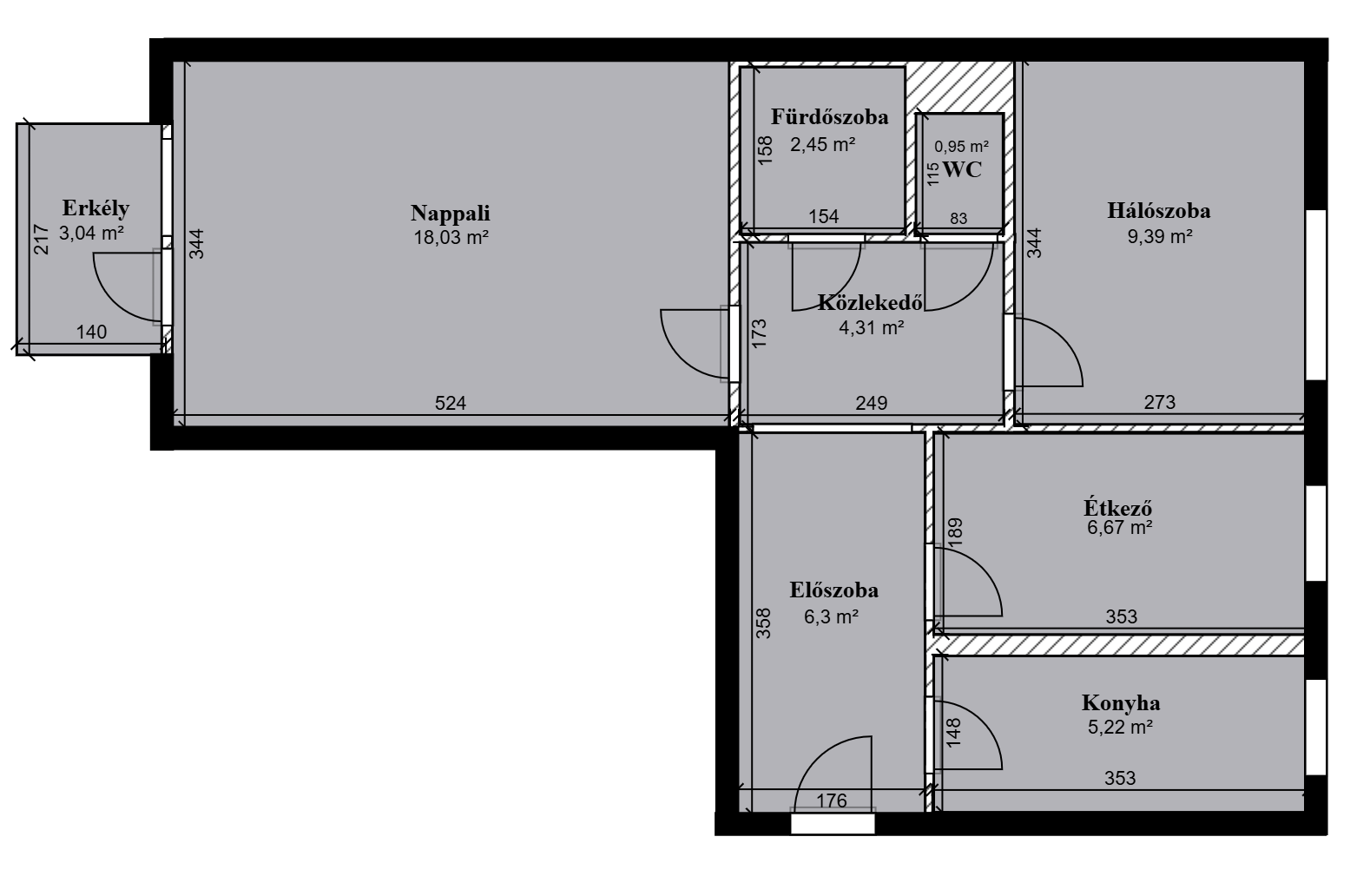 -53 négyzetméter – hálószoba, étkező, konyha, nappali, fürdőszoba, WC