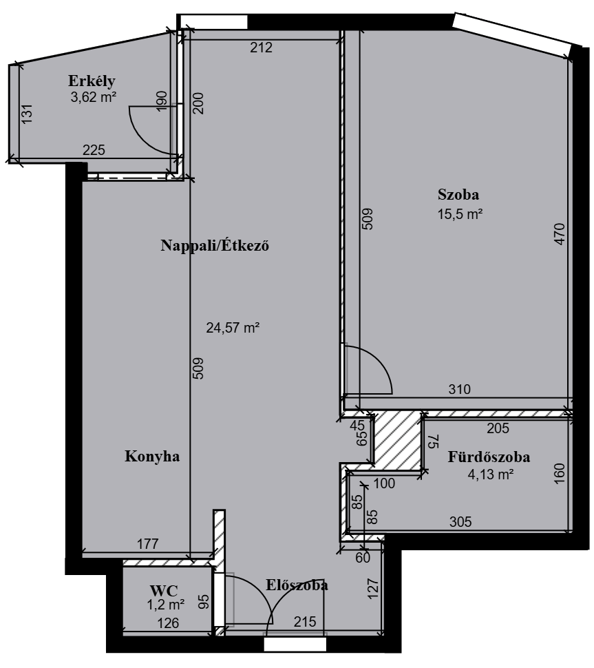 -45,5 négyzetméter – hálószoba, konyha, nappali/étkező, fürdőszoba, WC