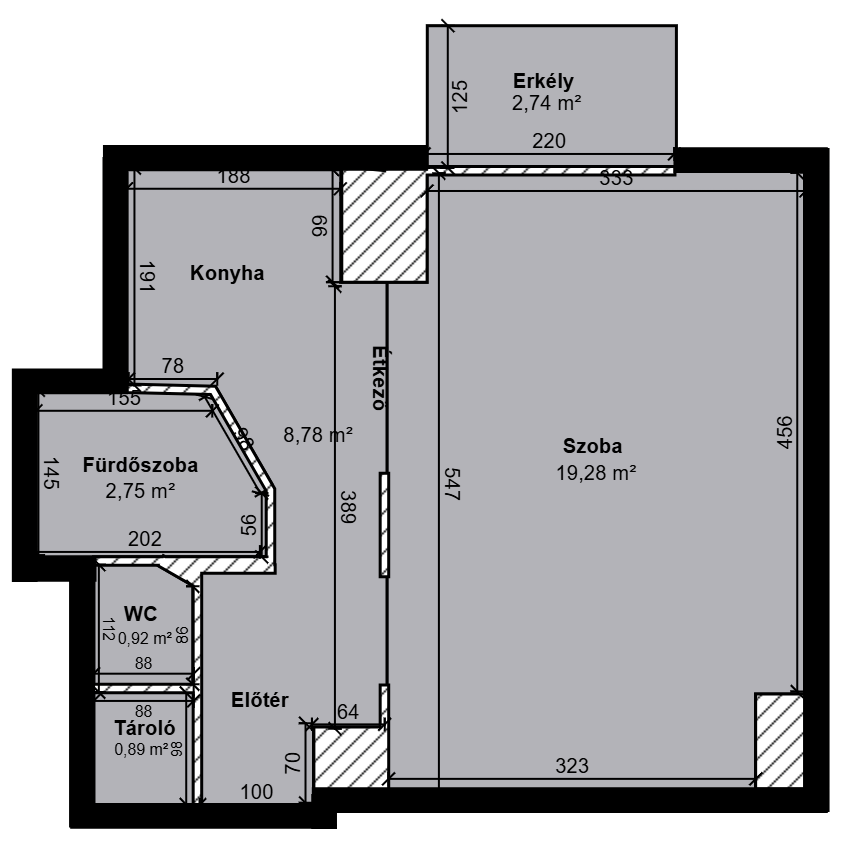 - 33 négyzetméter - konyha + étkező, hálószoba/nappali, fürdőszoba, WC, erkély, tároló/gardrób